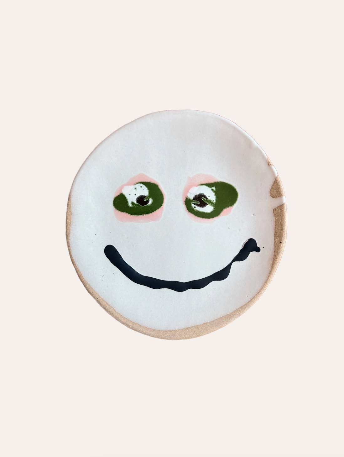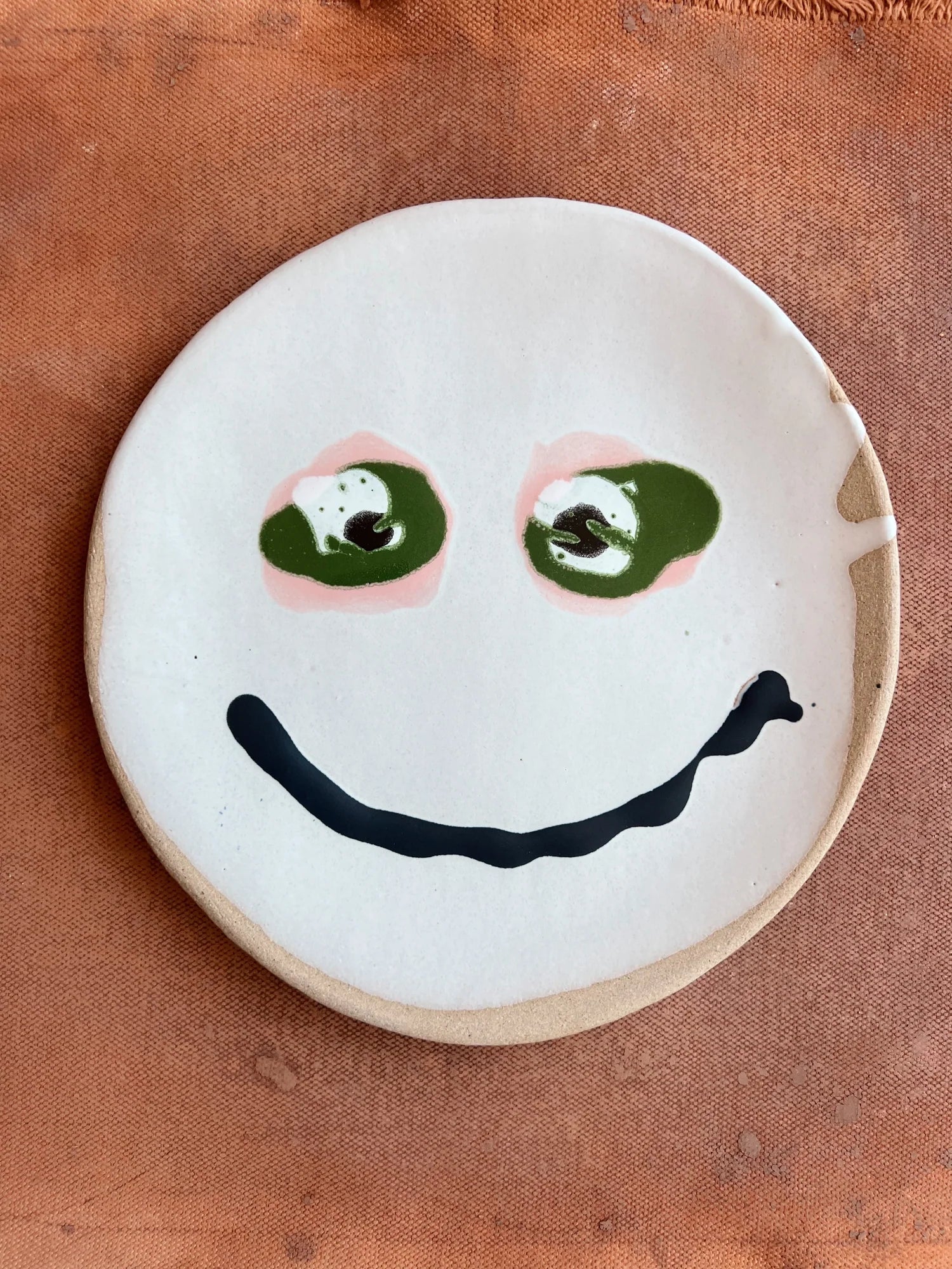 Matte white dinner plate with high gloss glazed smiley face