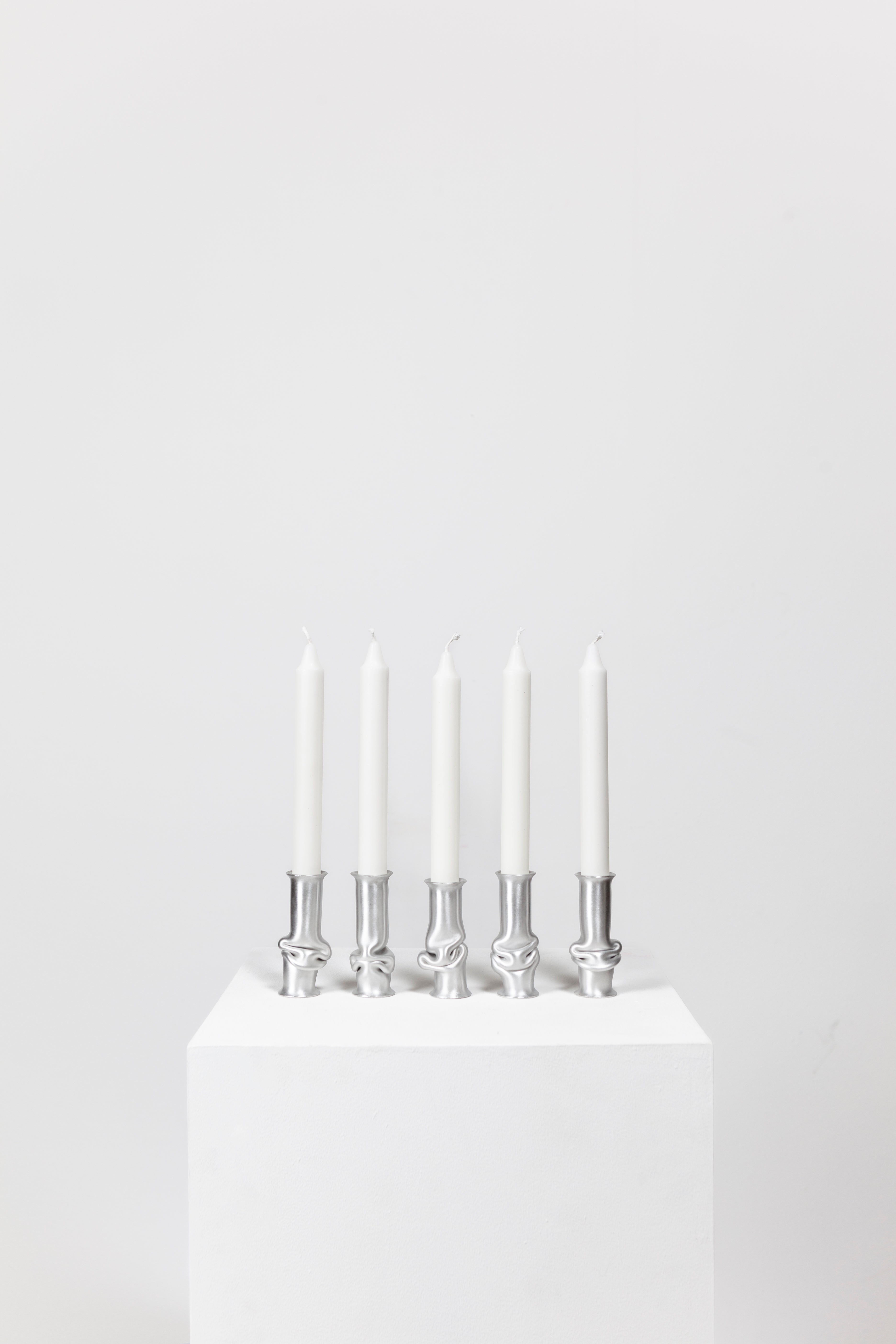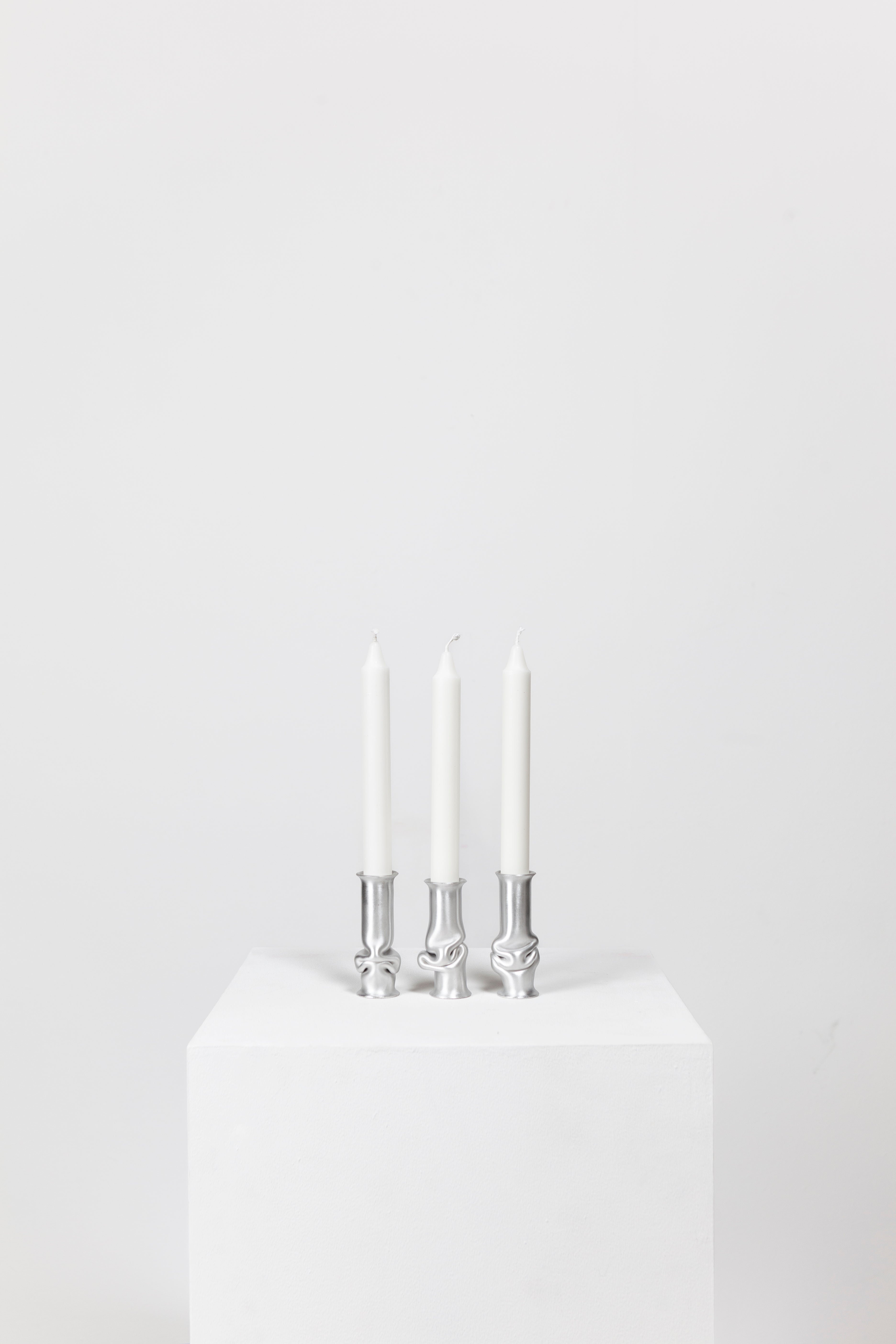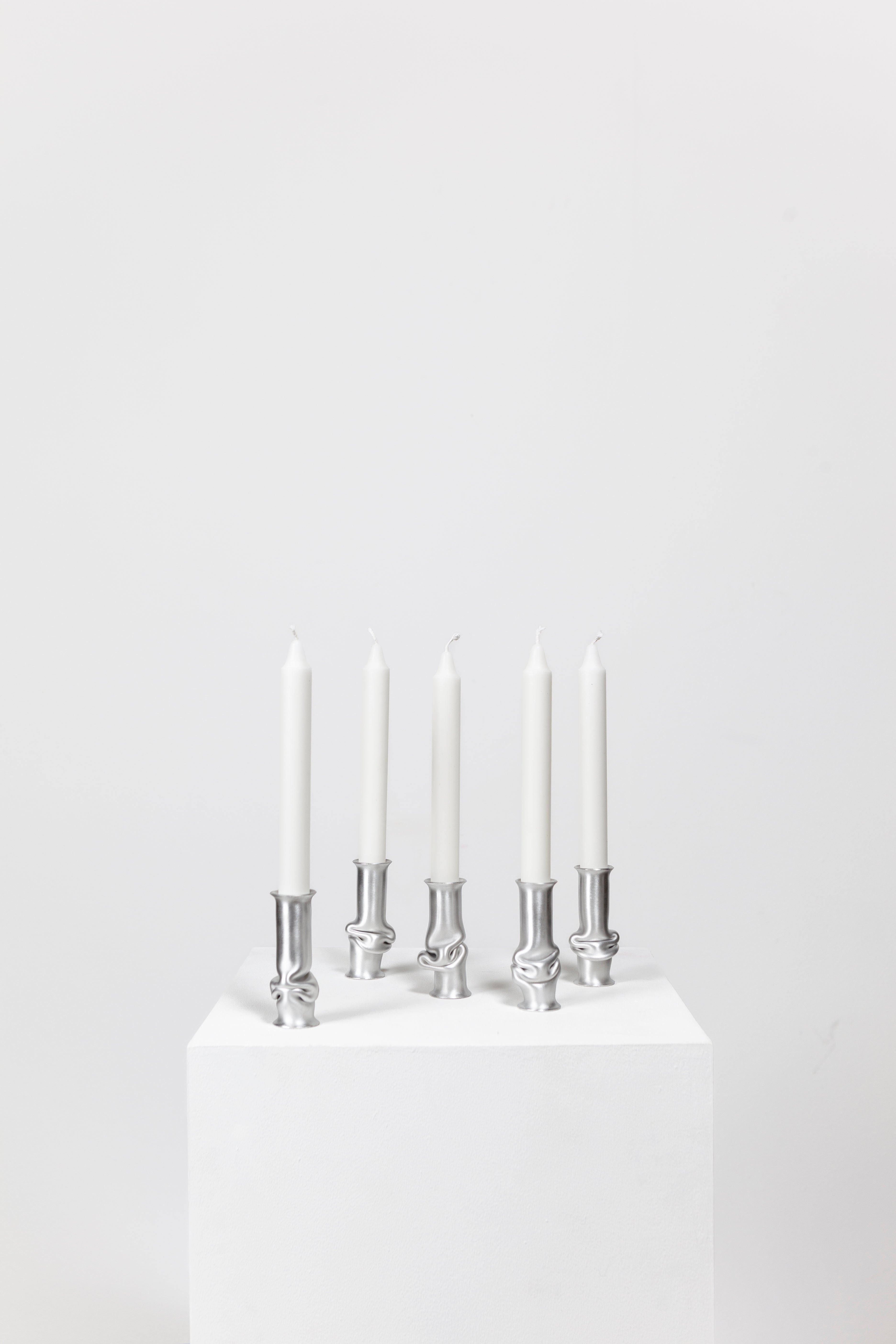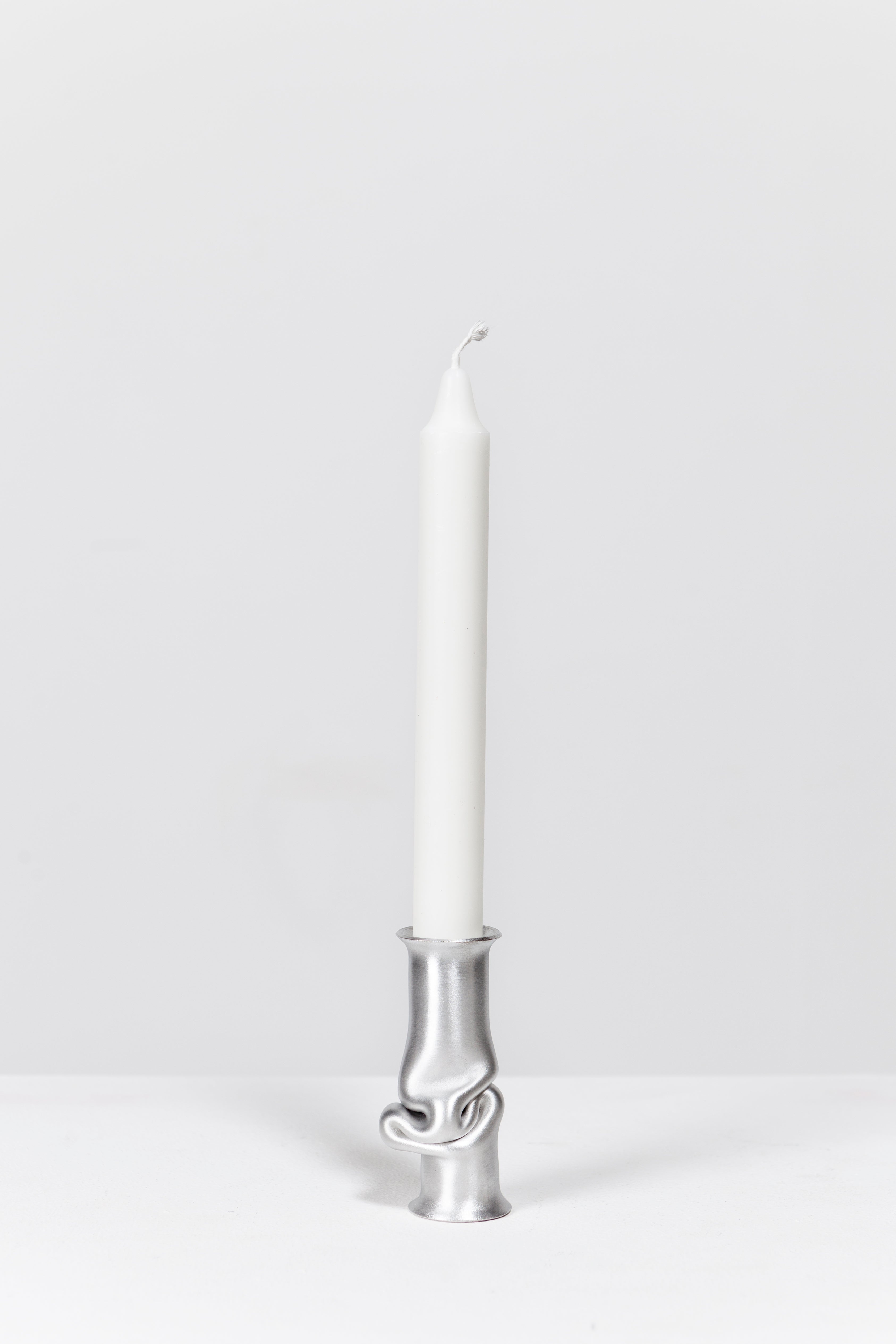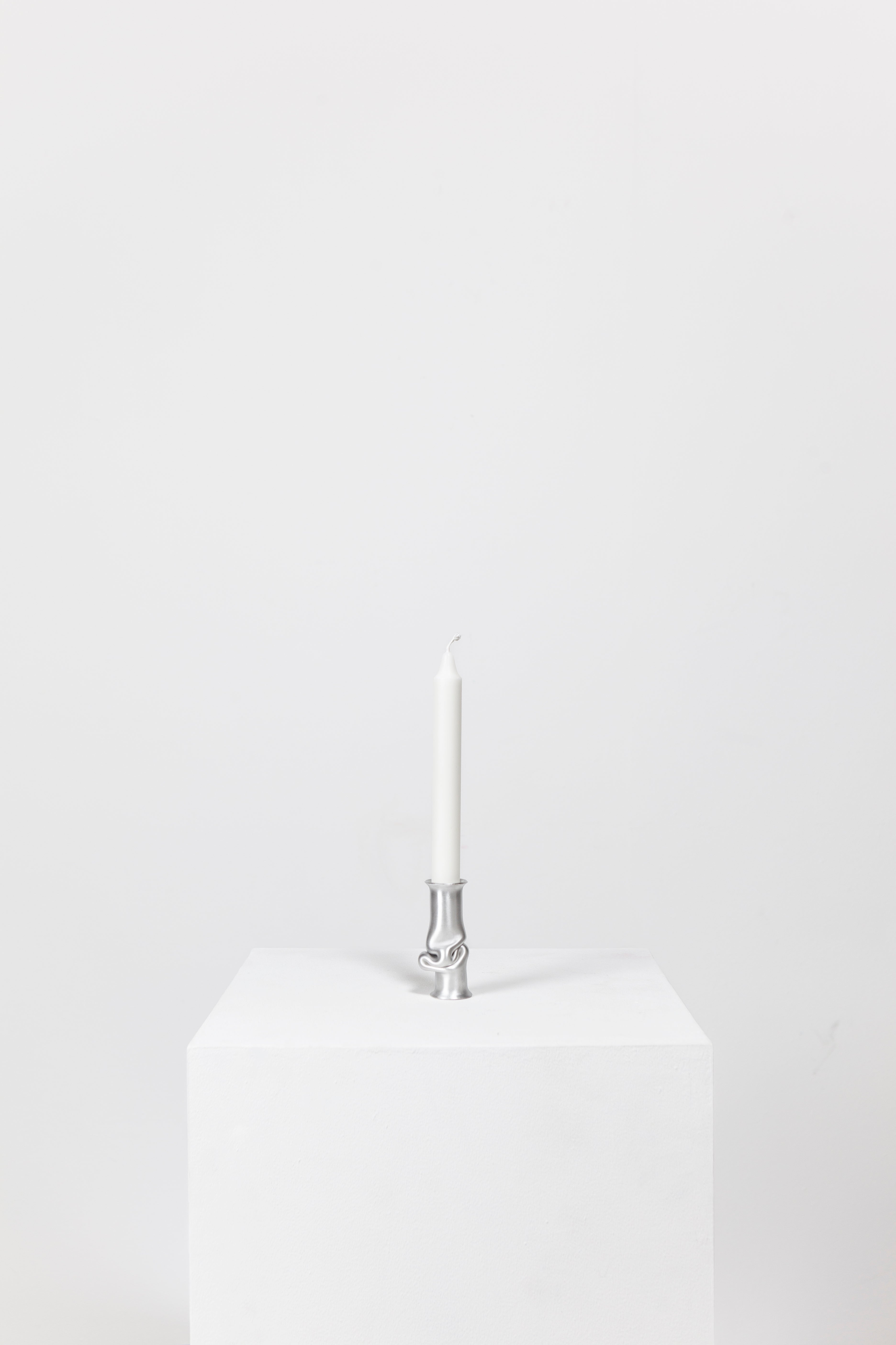 The Solo Candle Holder is made from aluminum tube. Each end is stretched out to form both a collar and a base without adding material. It is then heated up and pressed together, leaving space for the aluminum to take a unique shape. Available in different colors.