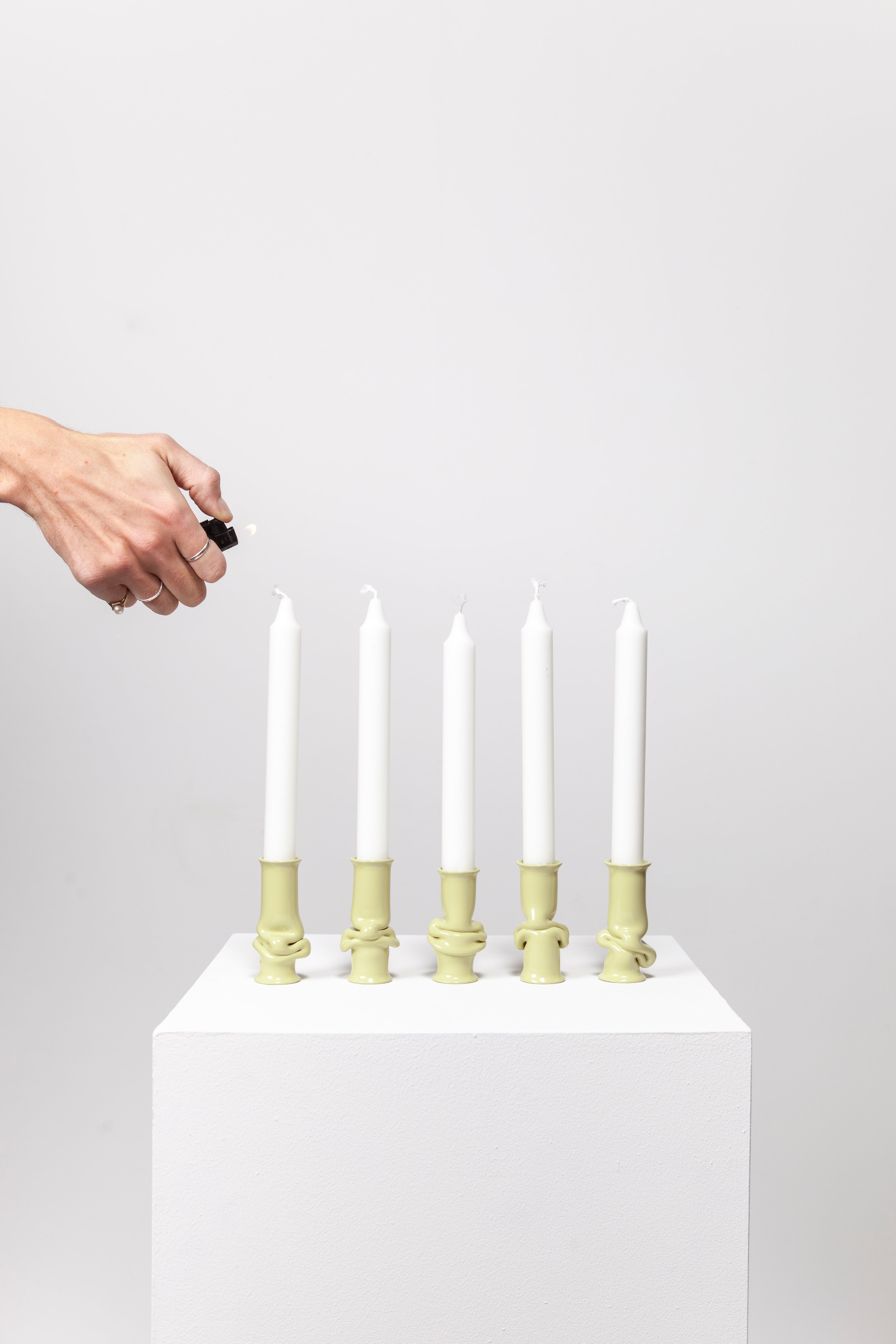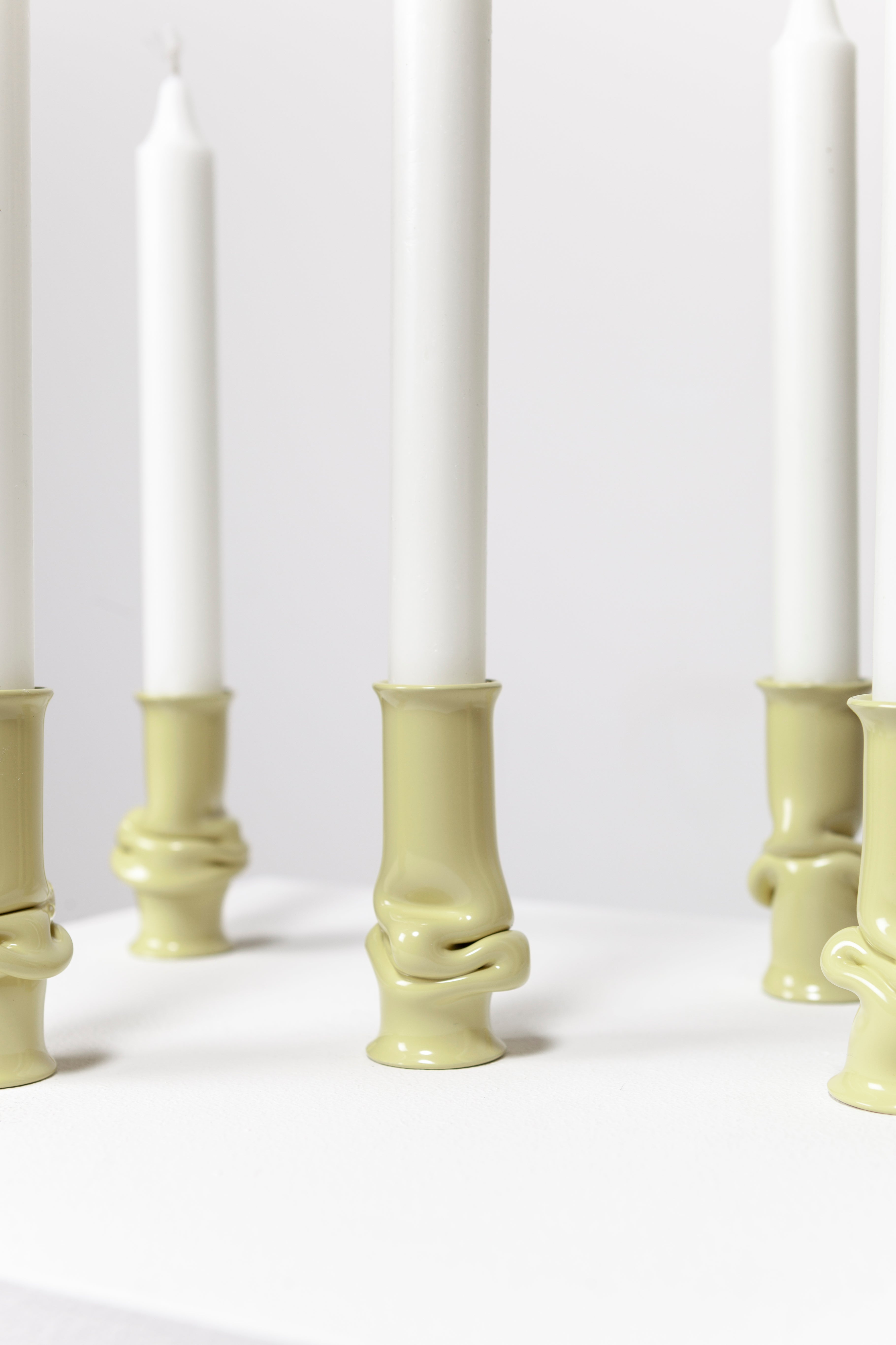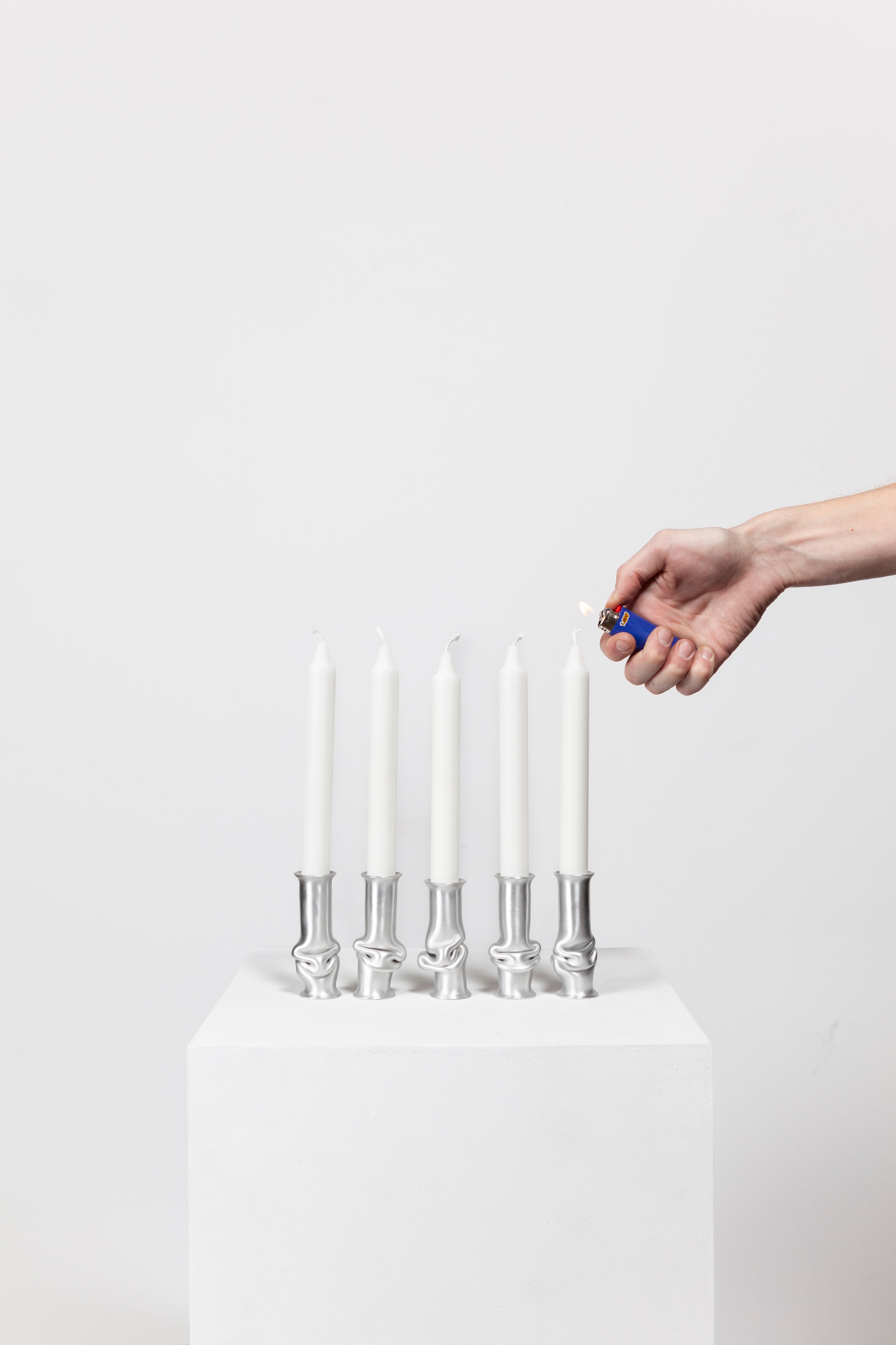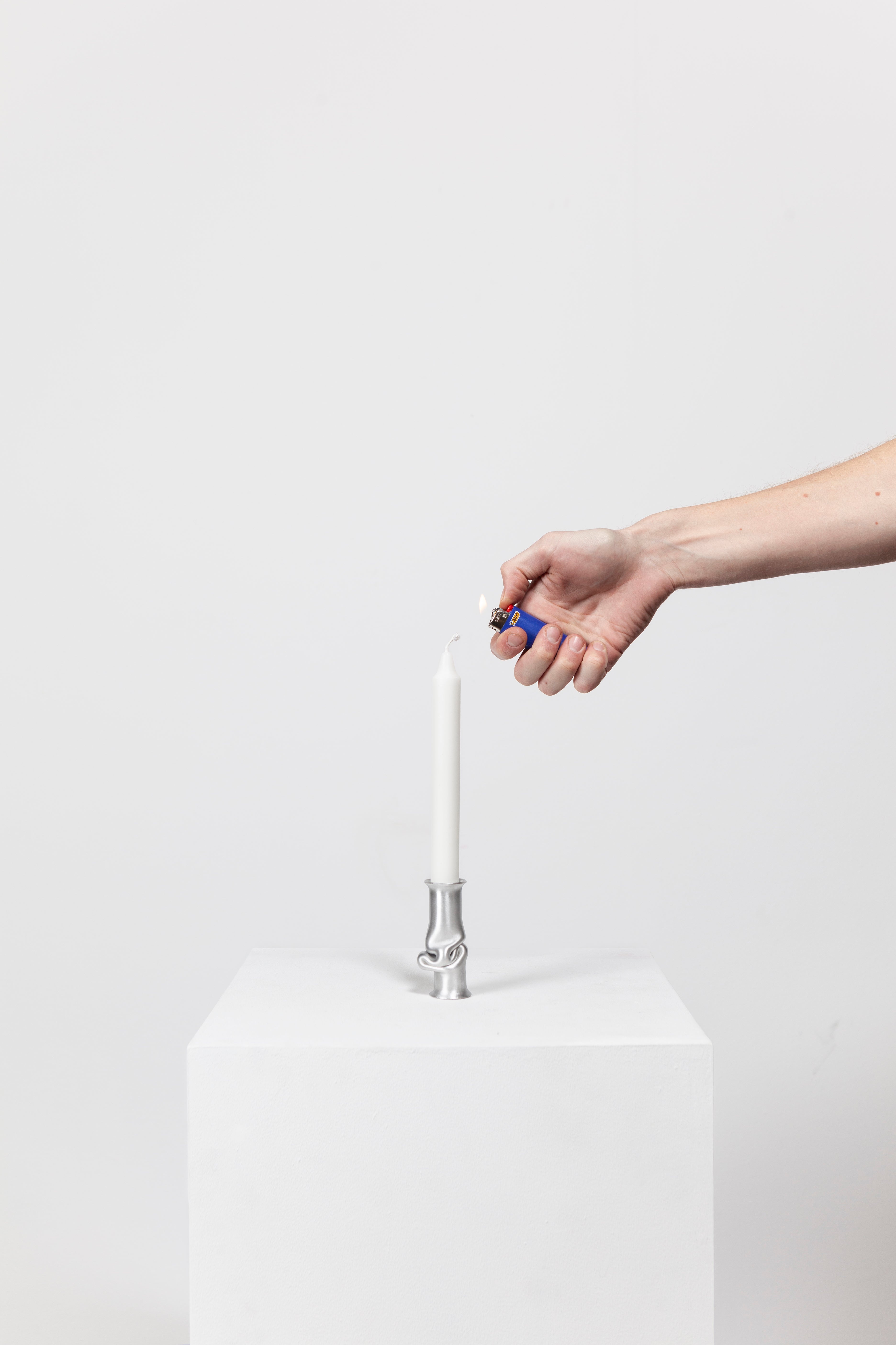 The Solo Candle Holder is made from aluminum tube. Each end is stretched out to form both a collar and a base without adding material. It is then heated up and pressed together, leaving space for the aluminum to take a unique shape. Available in different colors.