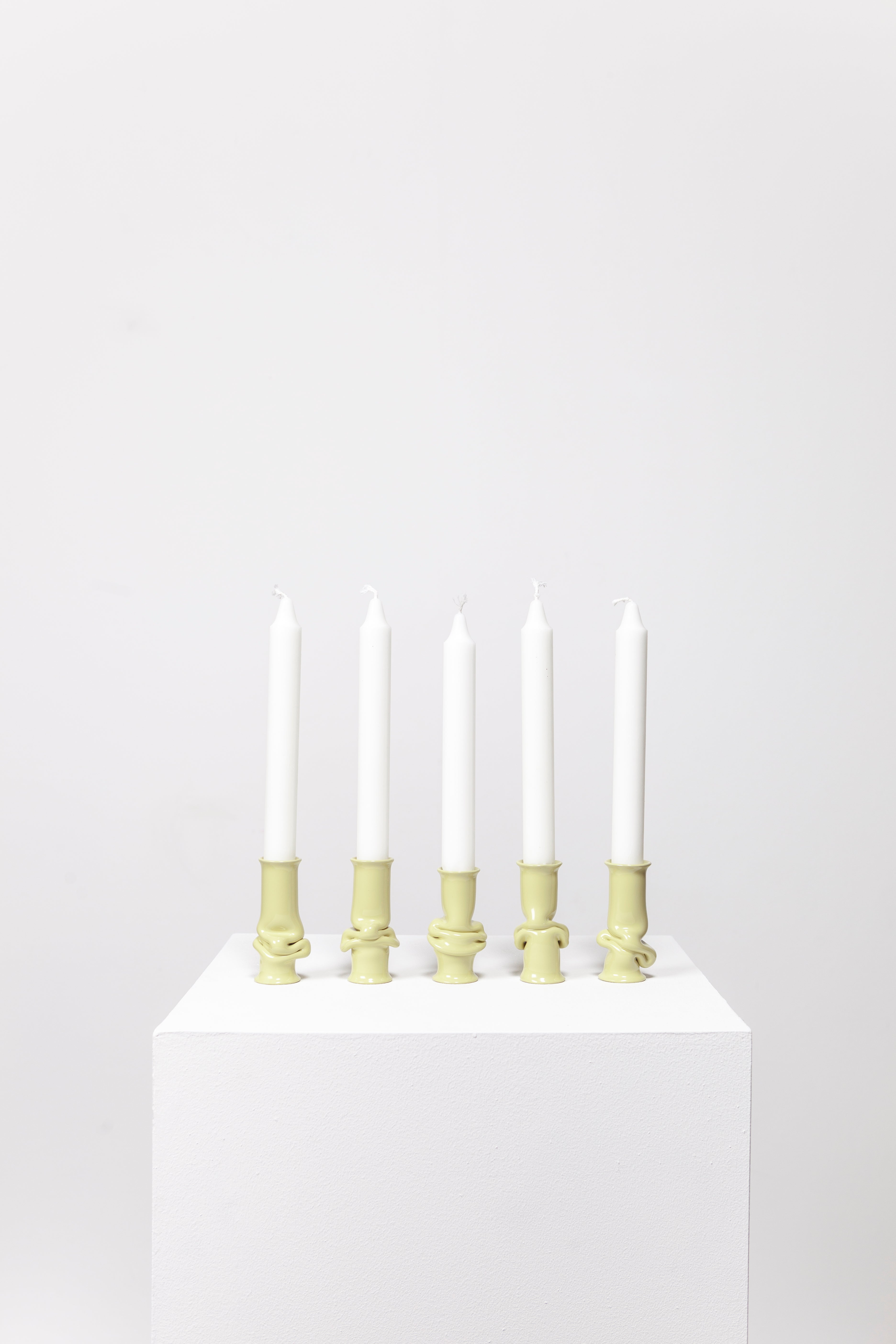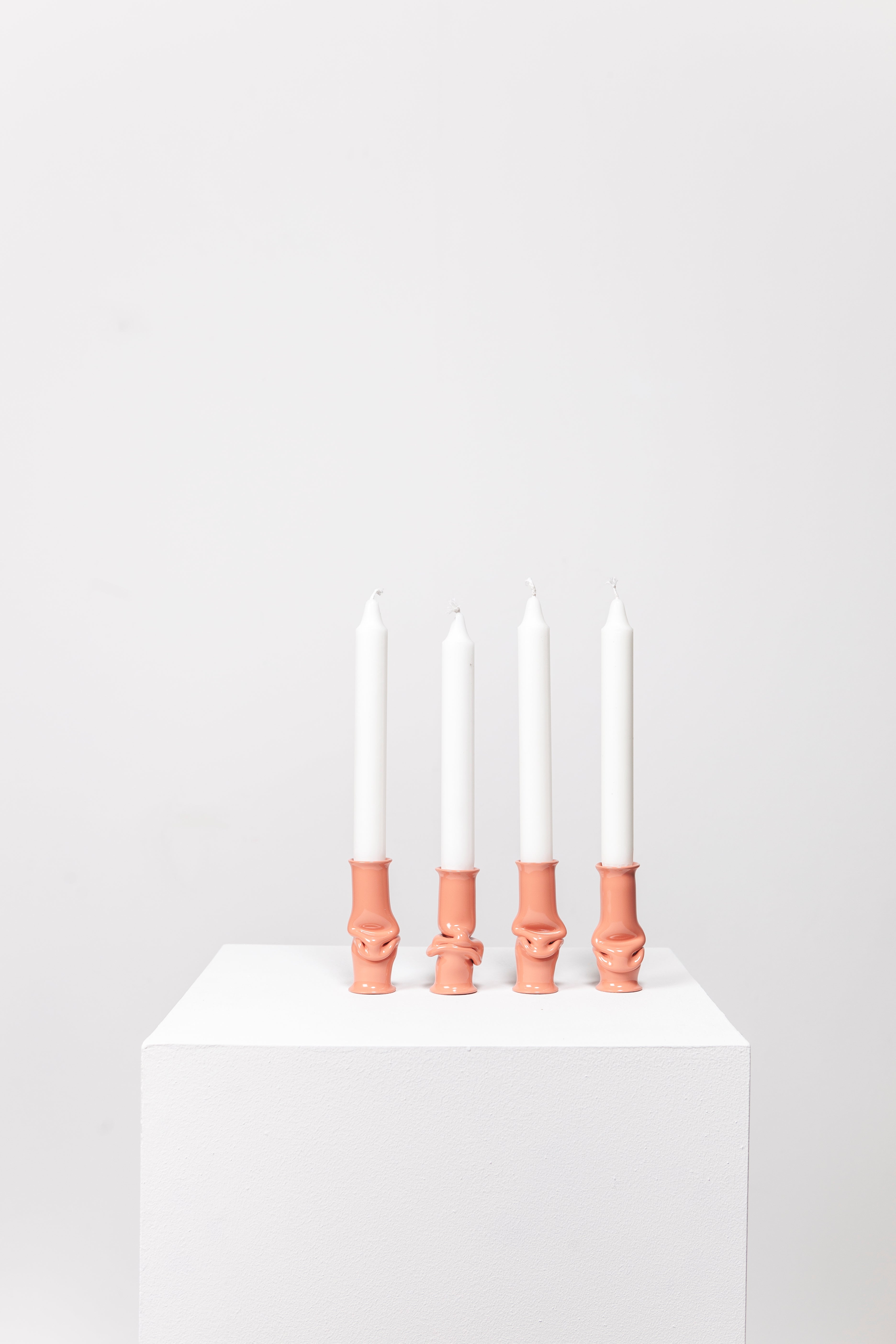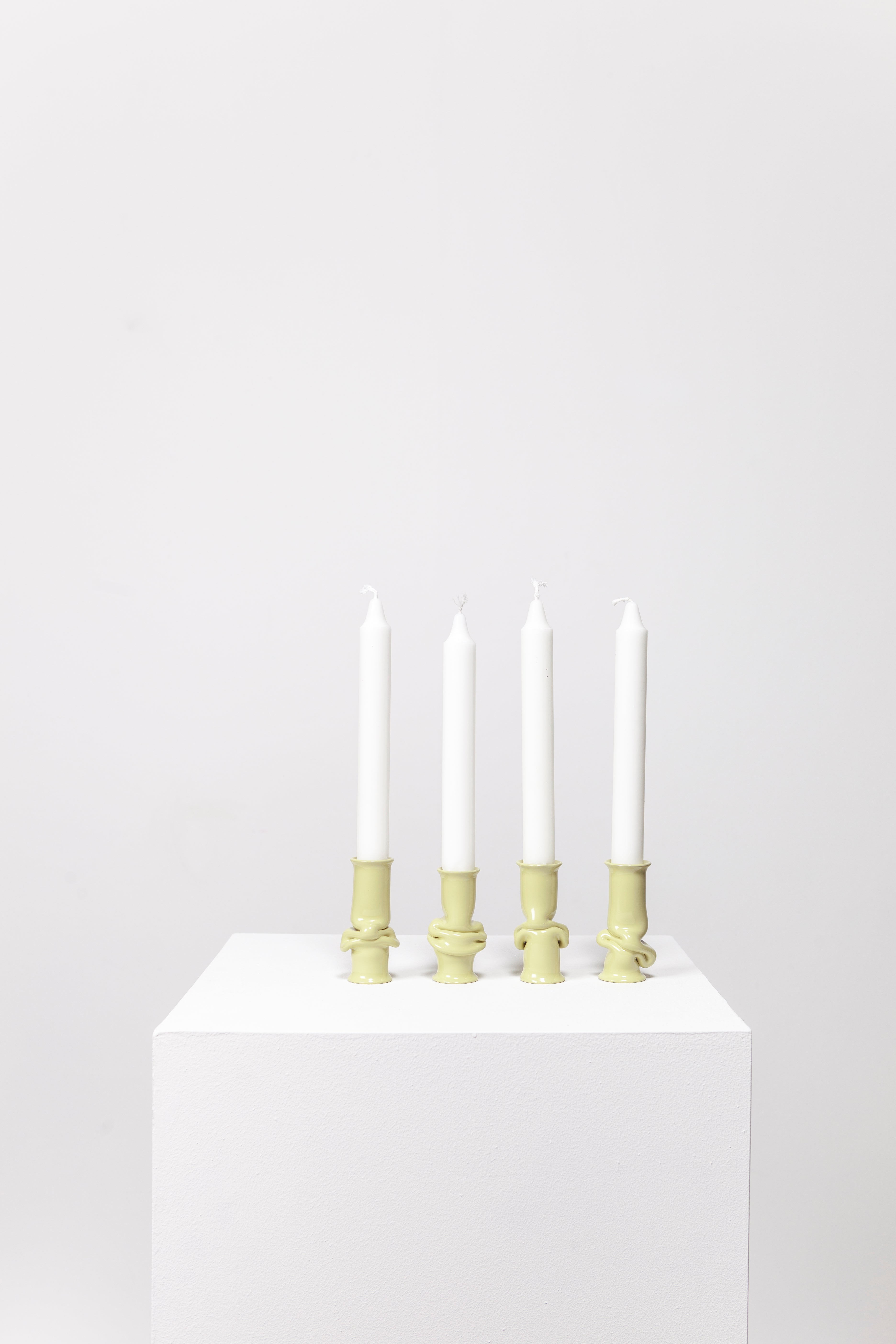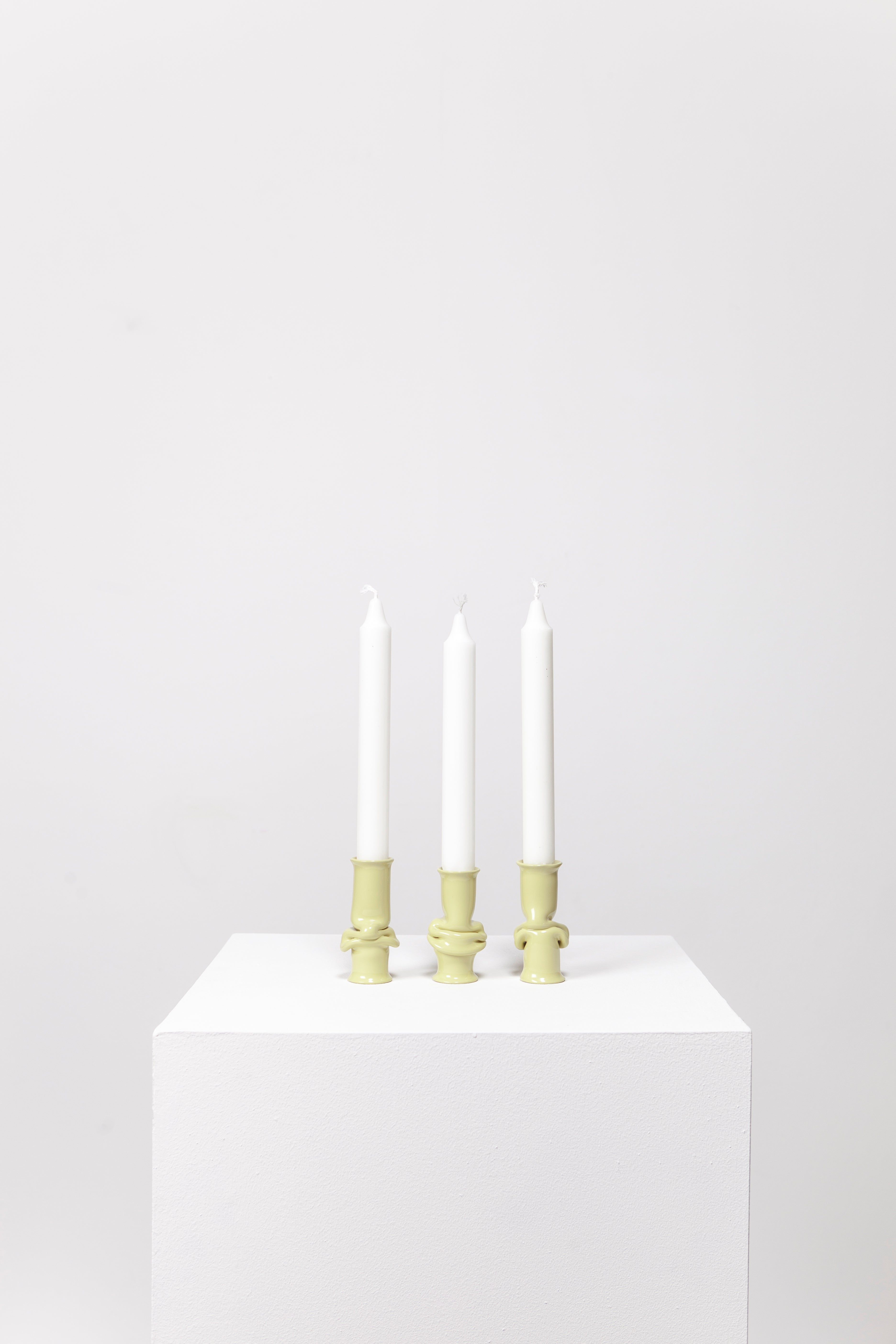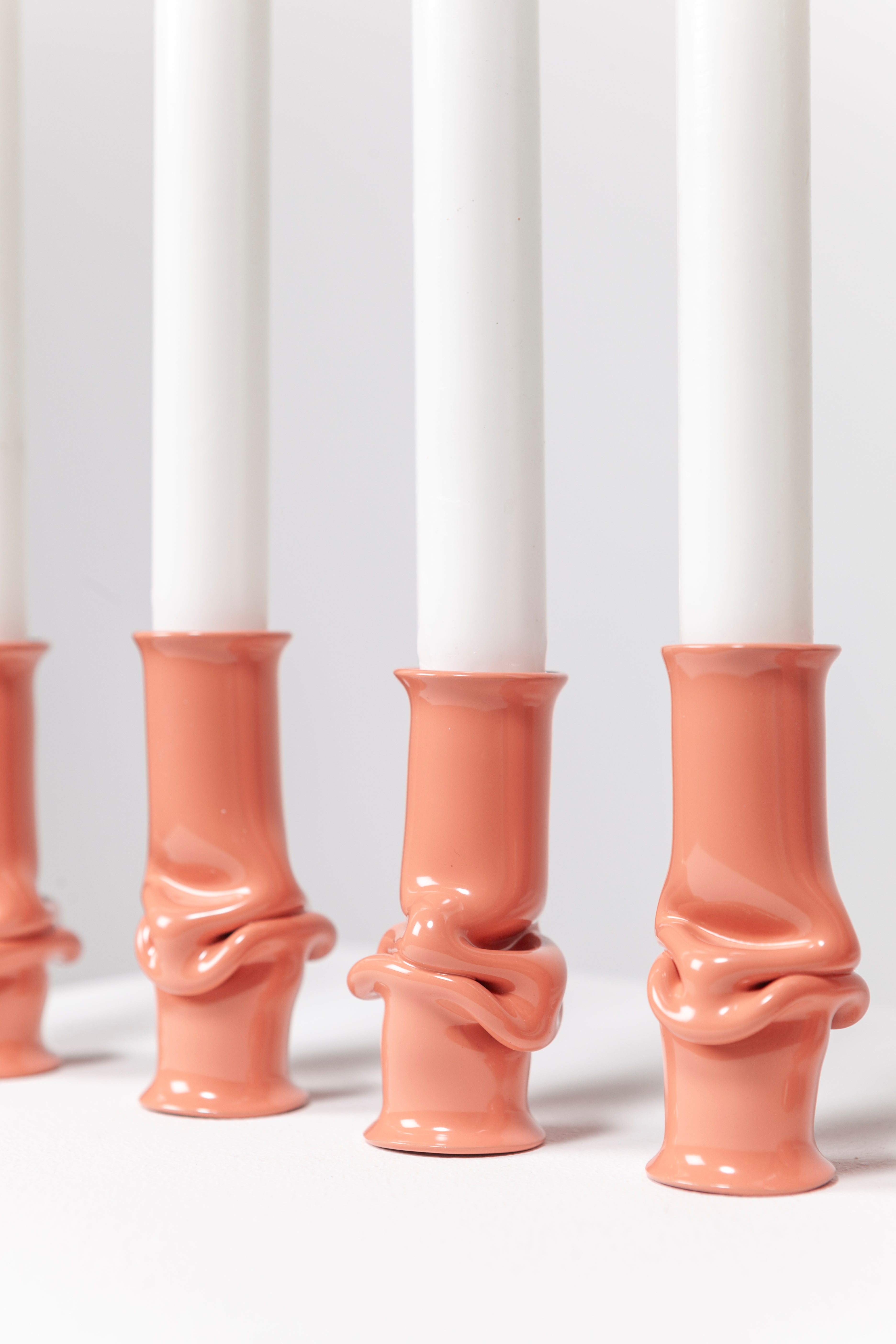 The Solo Candle Holder is made from aluminum tube. Each end is stretched out to form both a collar and a base without adding material. It is then heated up and pressed together, leaving space for the aluminum to take a unique shape. Available in different colors.