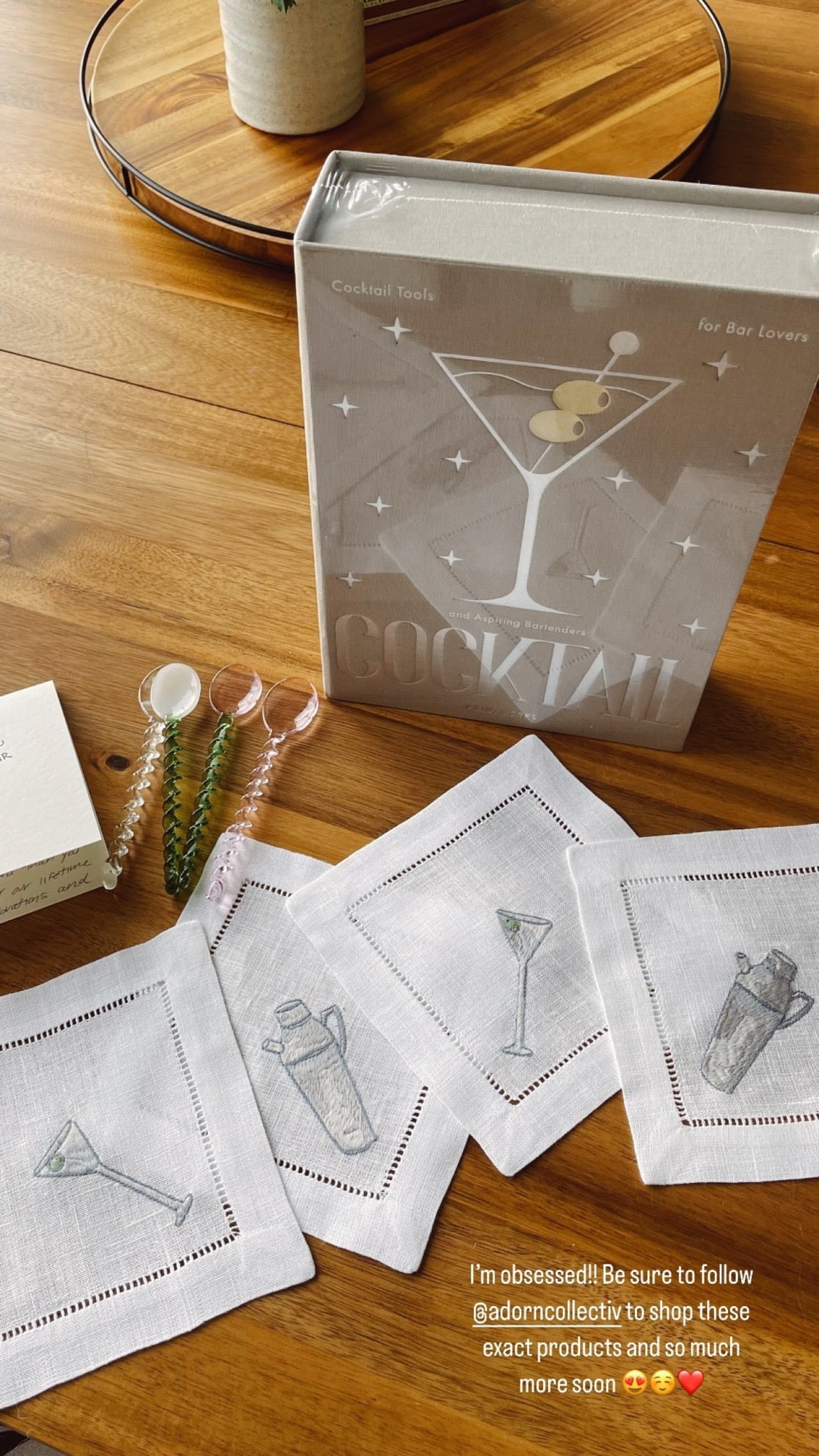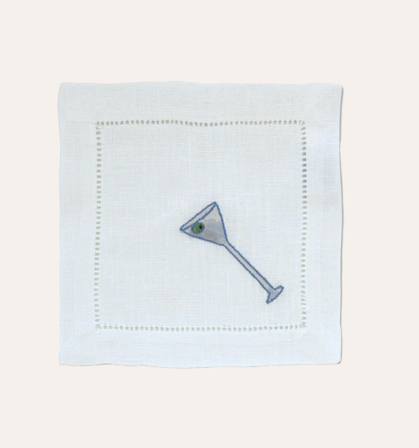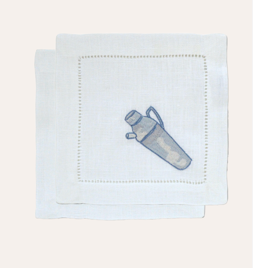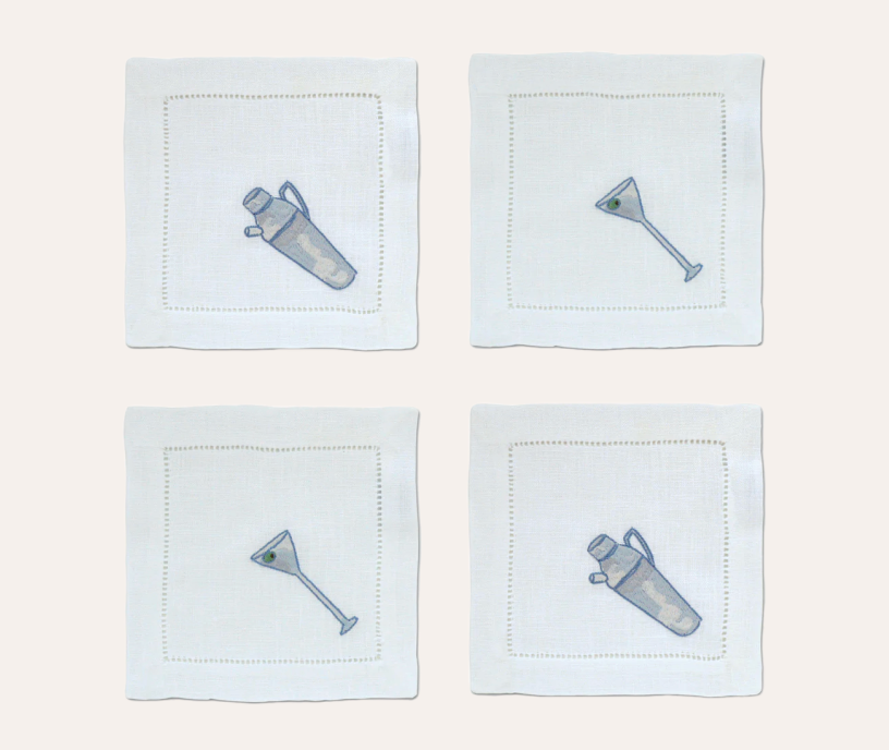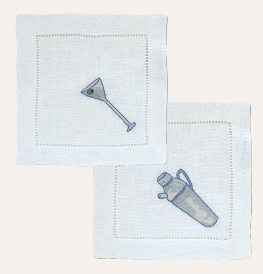 Get ready to shake things up with these Martini Lover's Cocktail Napkin Set. Each set includes 2 napkins embroidered with martinis and 2 napkins adorned with shakers. Combine with our cocktail tools & spoons for a perfect gift. Sold as a set of 4.