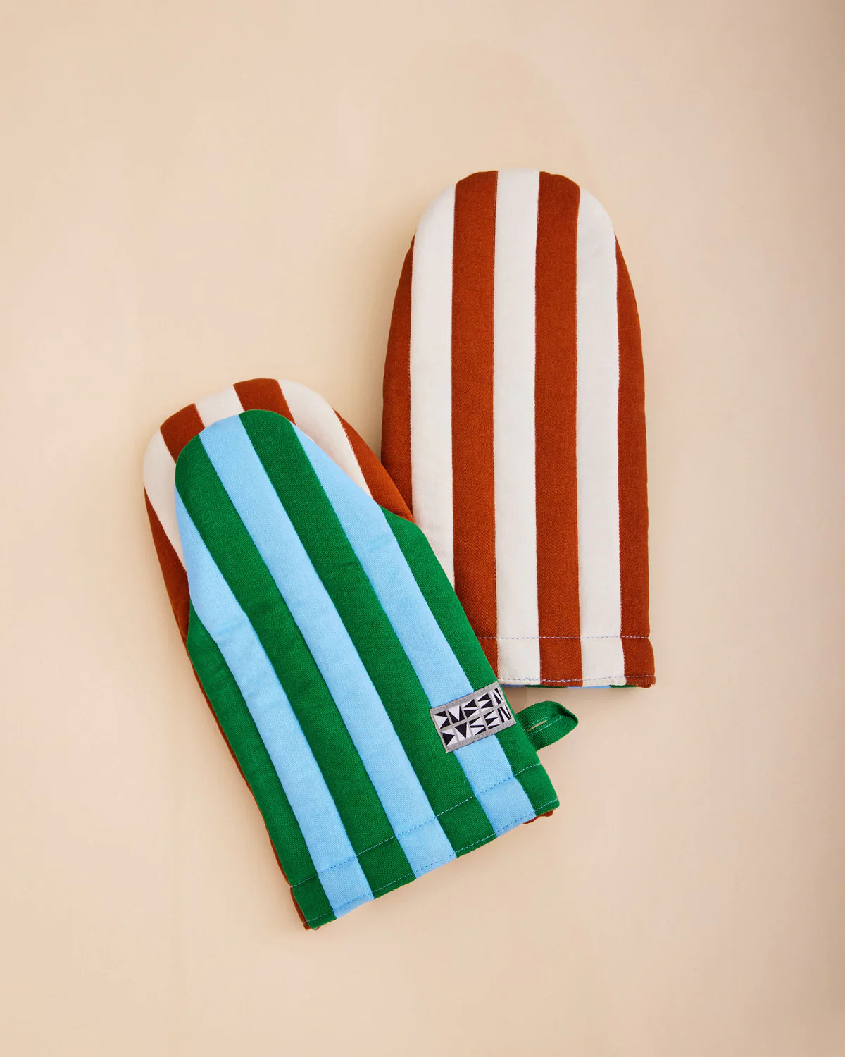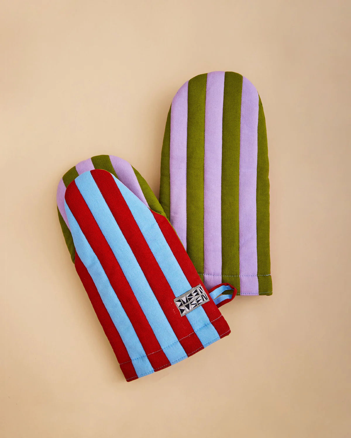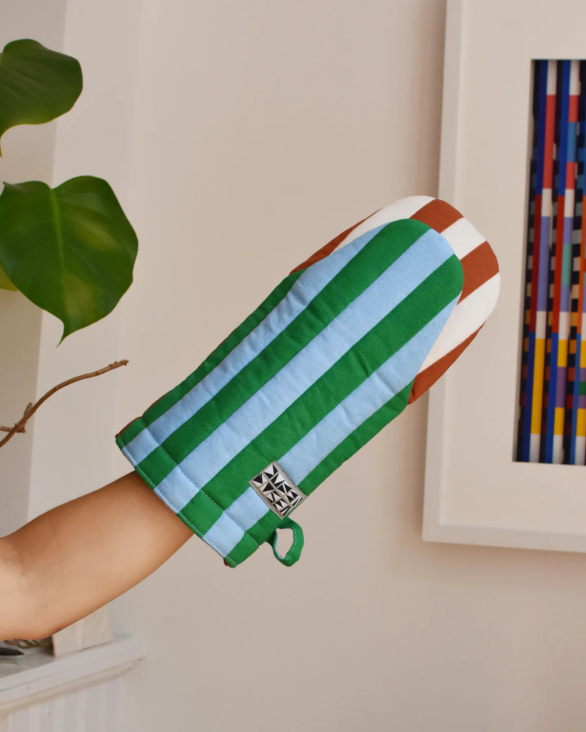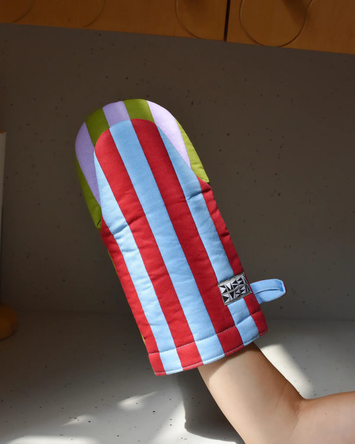Resists temperatures up to 400 degrees Fahrenheit. Padded oven mitt in contrasting stripe colorways. Features a "frog-style" mitt shape, top stitched brand label, and a side loop. 100% cotton quilted canvas base, with polyester fill.