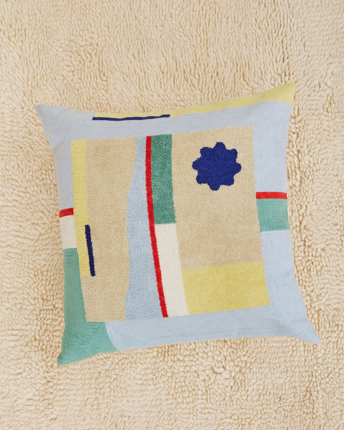100% cotton embroidery and tufting. Non-embroidered natural canvas back with a zipper opening. Polyfill-down alternative inserts mimic the fluffiness of natural down.