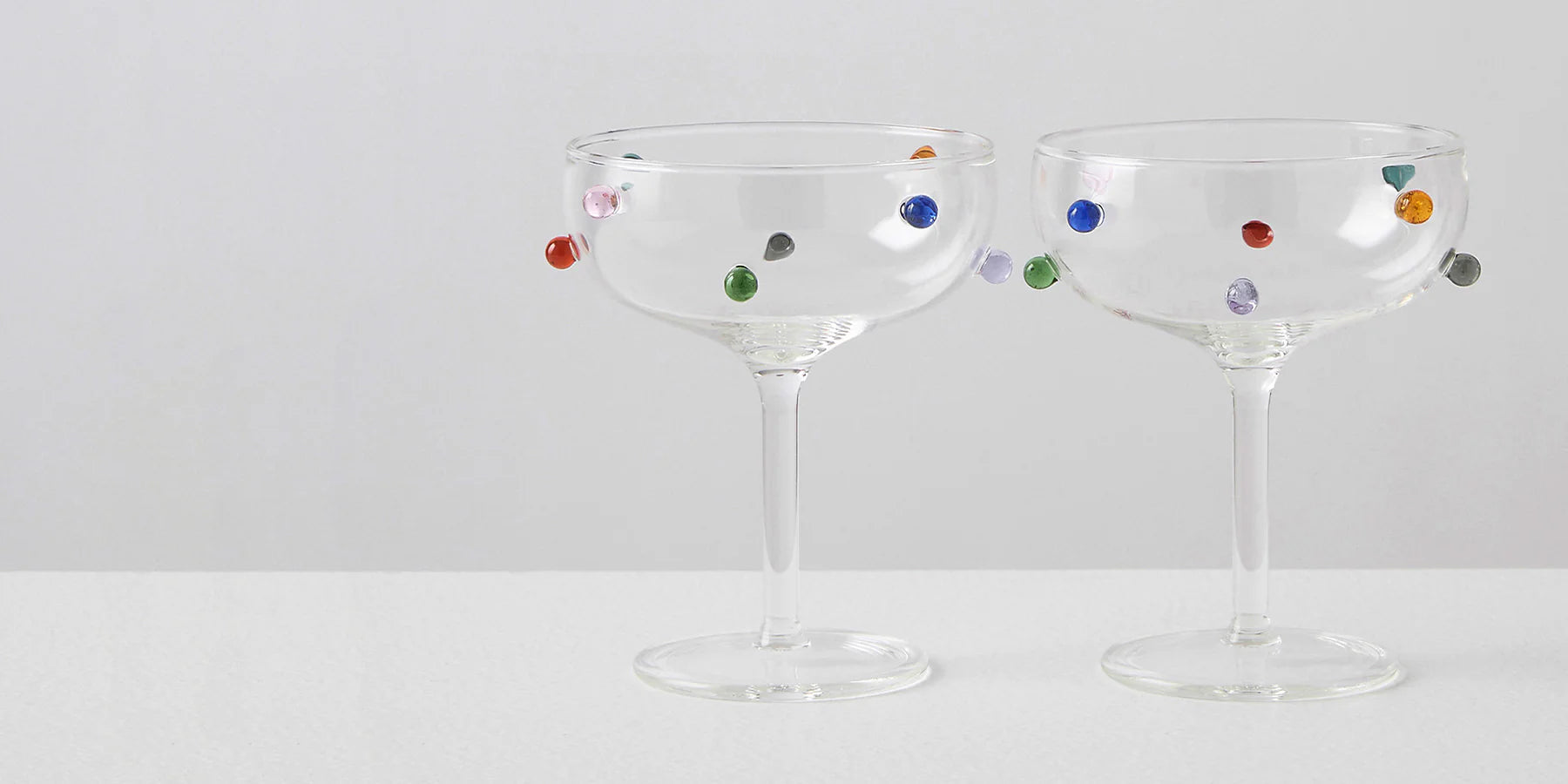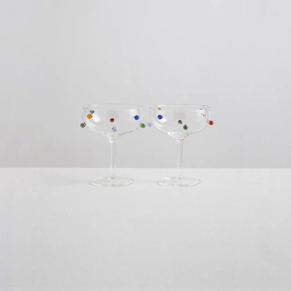 Introducing the Pomponette champagne coupes, a playful set of handmade glasses decorated with jeweled amber bubbles. We strongly recommend inviting the Pomponette duo to all celebrations; they make the most satisfying clink! Sold as a pair.