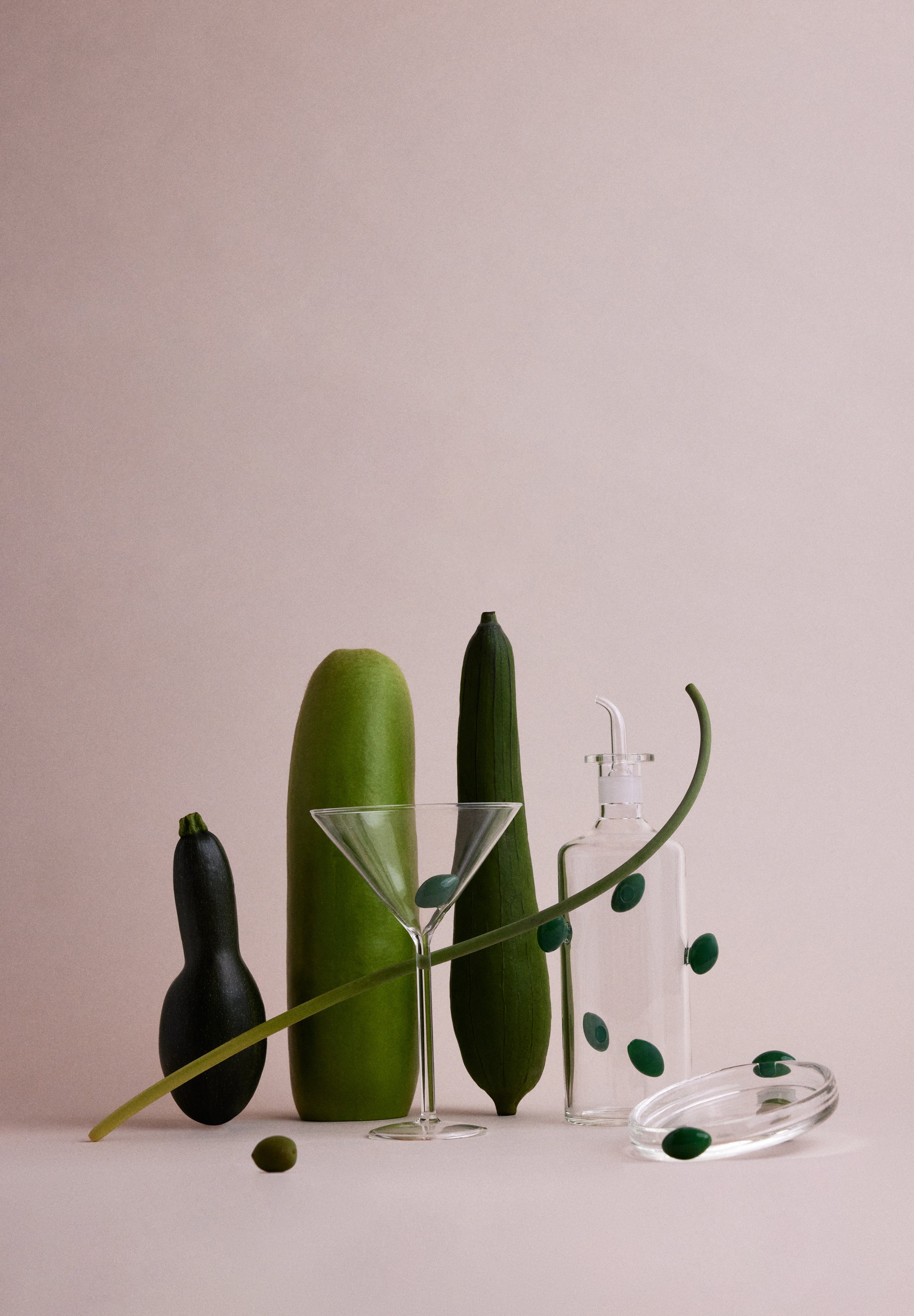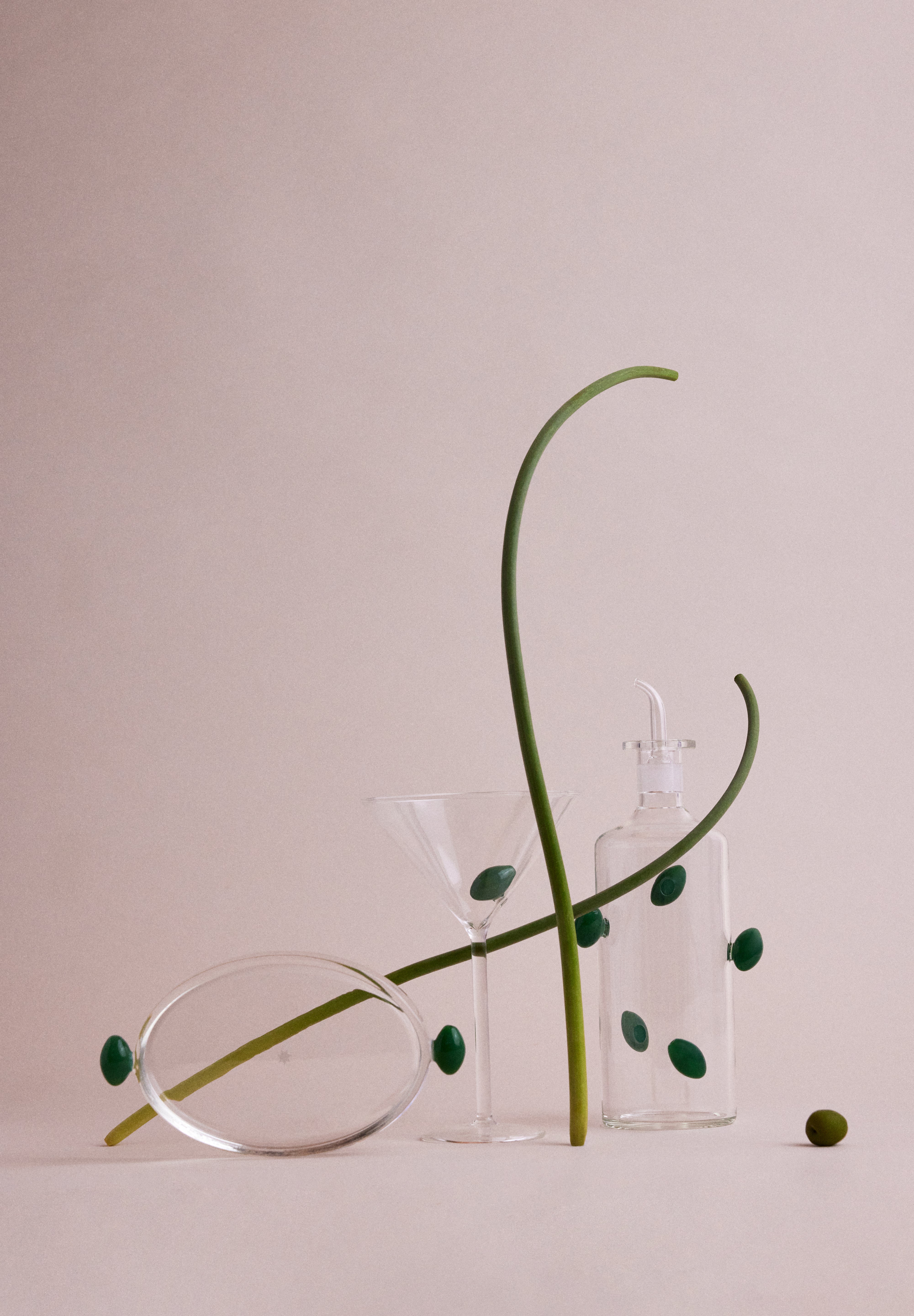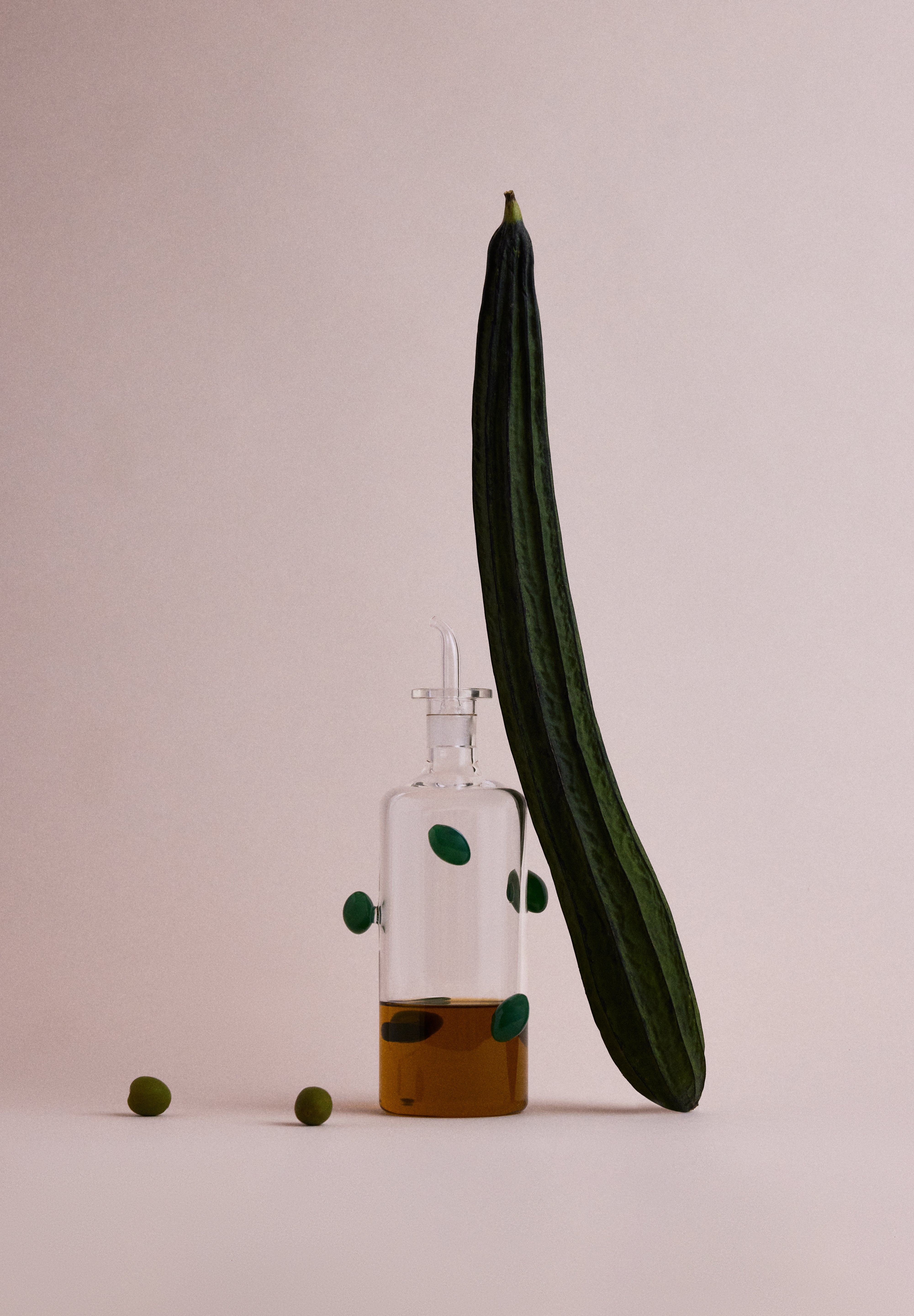 Oil, but make it cute. An ode to late summer dinners where the warm Mediterranean breeze mingles with sun-kissed cheeks and salty skin. This olive oil bottle stands generously studded with plump green olives.