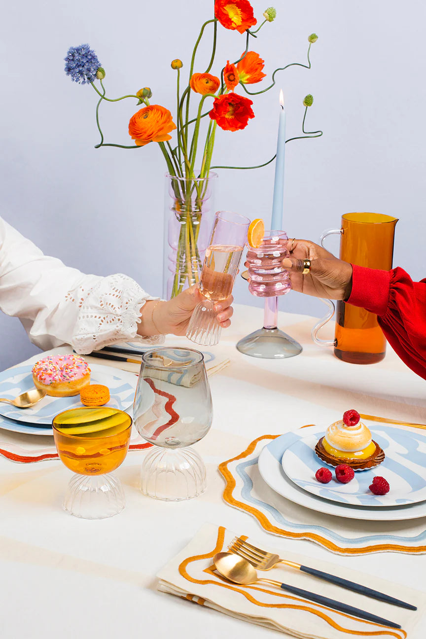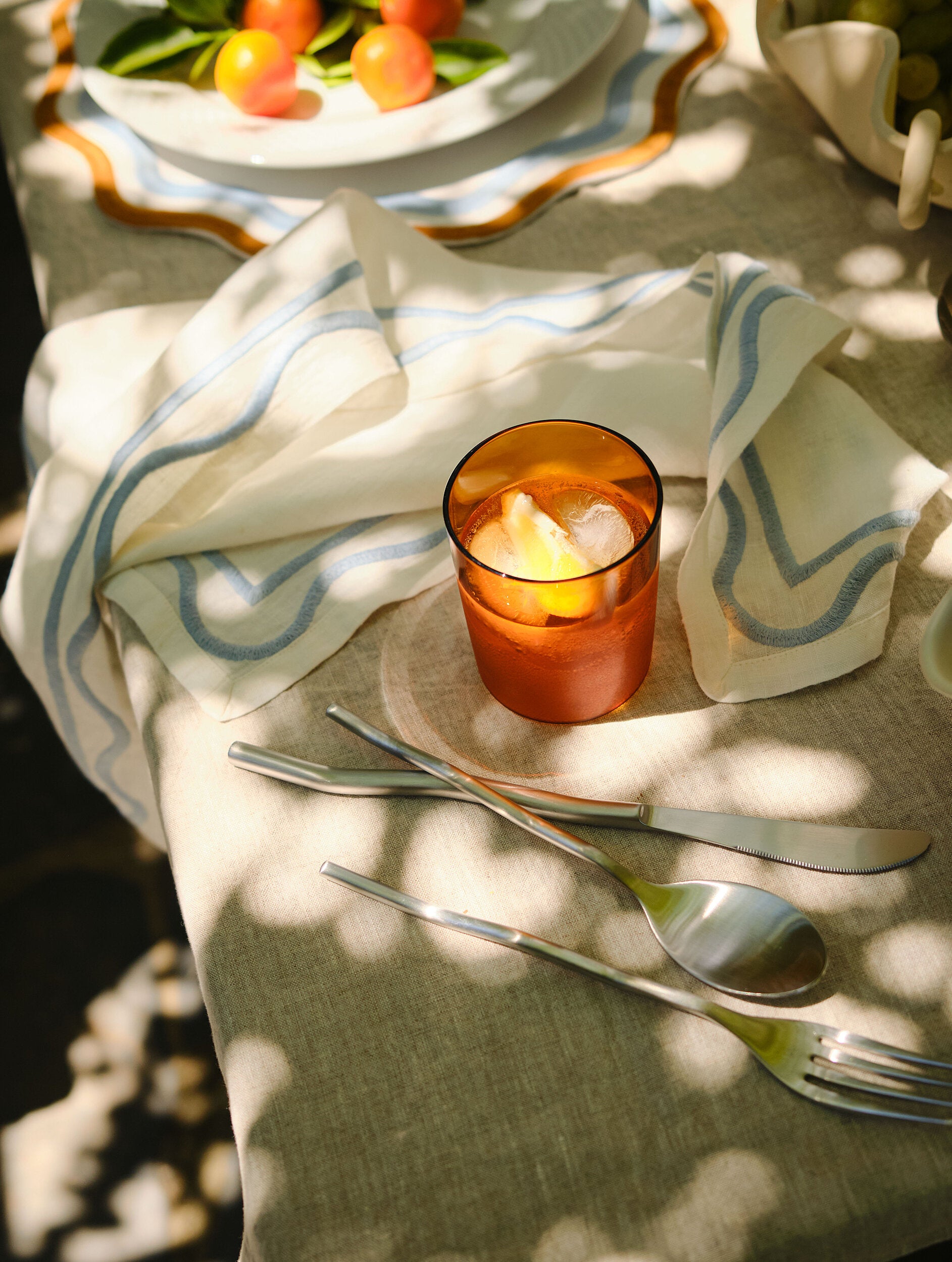 Table Tip: We love a crisp triangular or rectangular fold to offset the squiggle, but you really can’t go wrong.