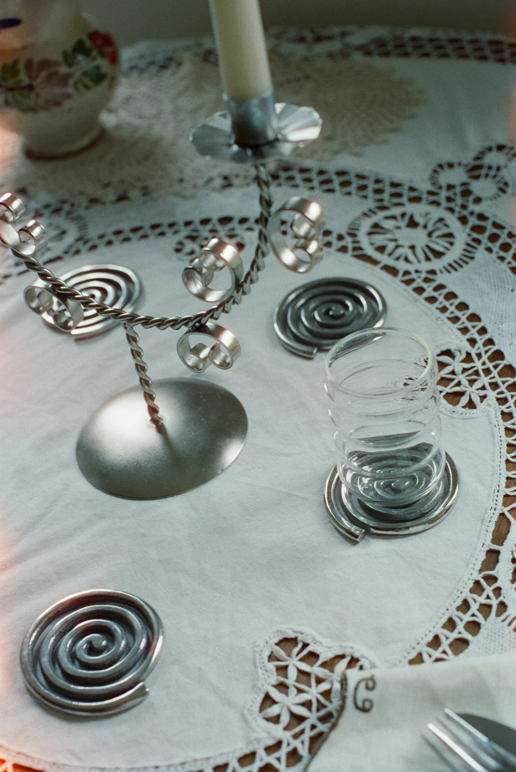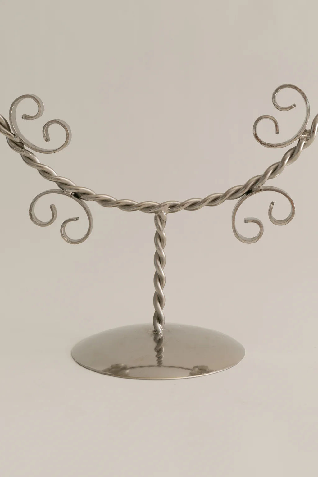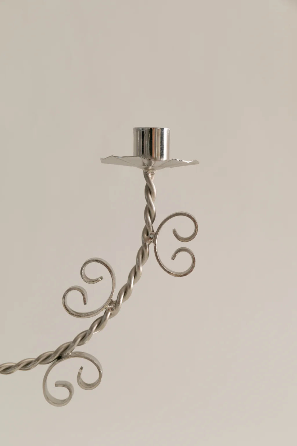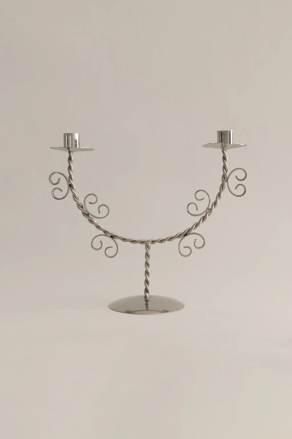 A stainless steel, double arm candelabra that has been twisted and plated in nickel. It's delicate twists and twirls are substantial enough to make a proud statement, all the while staying discreet.